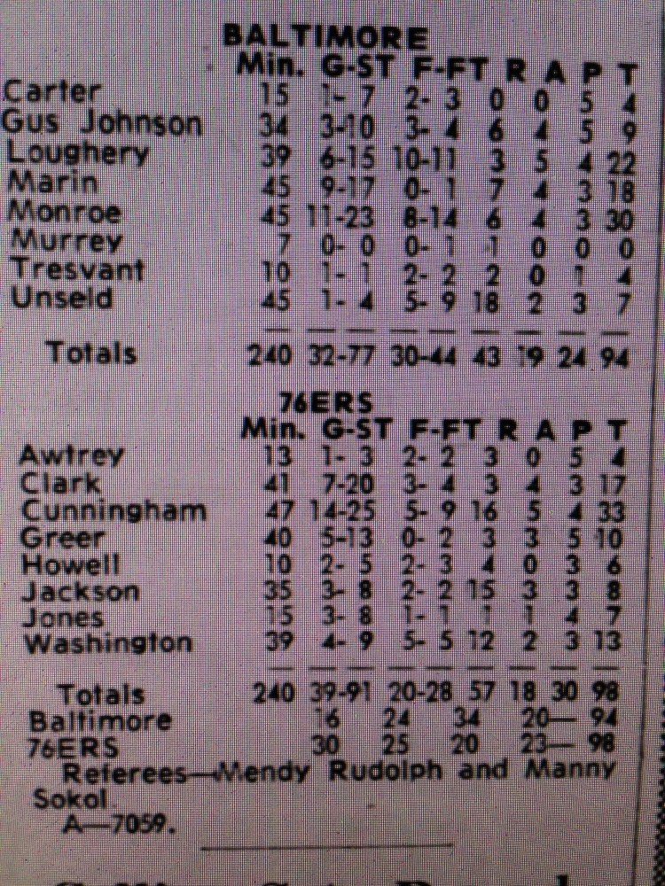 With 3:29 to go and the Bullets ahead, 88-87, Archie Clark drove on Johnson, used every move he had and then what he called an “ad lib.” Gus came down and Clark stayed up long enough to make the layup which put the 76ers ahead to stay. “That is what makes me proud of these guys,” said Ramsay. “Time and time and time again, we’ve gotten into situations where we needed a field goal, needed a big play at both ends of the court, and we’ve gotten it.” The final: 76ers 98, Bullets 94.