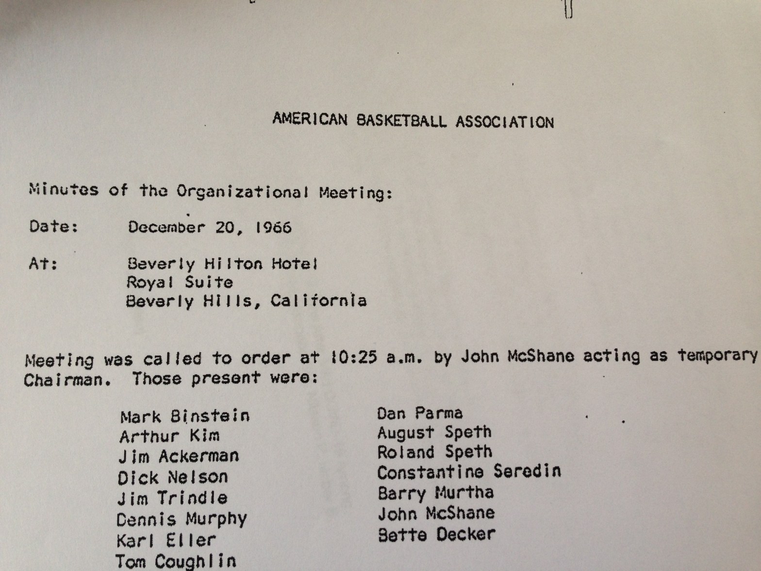 [While working on my latest book Shake and Bake, I interviewed Joe Geary, the now-late former minority owner of the ABA Dallas Chaparrals. Geary mentioned that, in preparation for the interview, he’d pulled his ABA file. “You still have an ABA file?” I asked. “Why yes,” he answered, “I was the league secretary for several years.” Geary graciously sent me this gem from his file: the minutes of the ABA’s first organizational meeting. This historic session was held on December 20, 1966 at the Beverly Hills Hilton, and I’ve transcribed the text to help with readability.