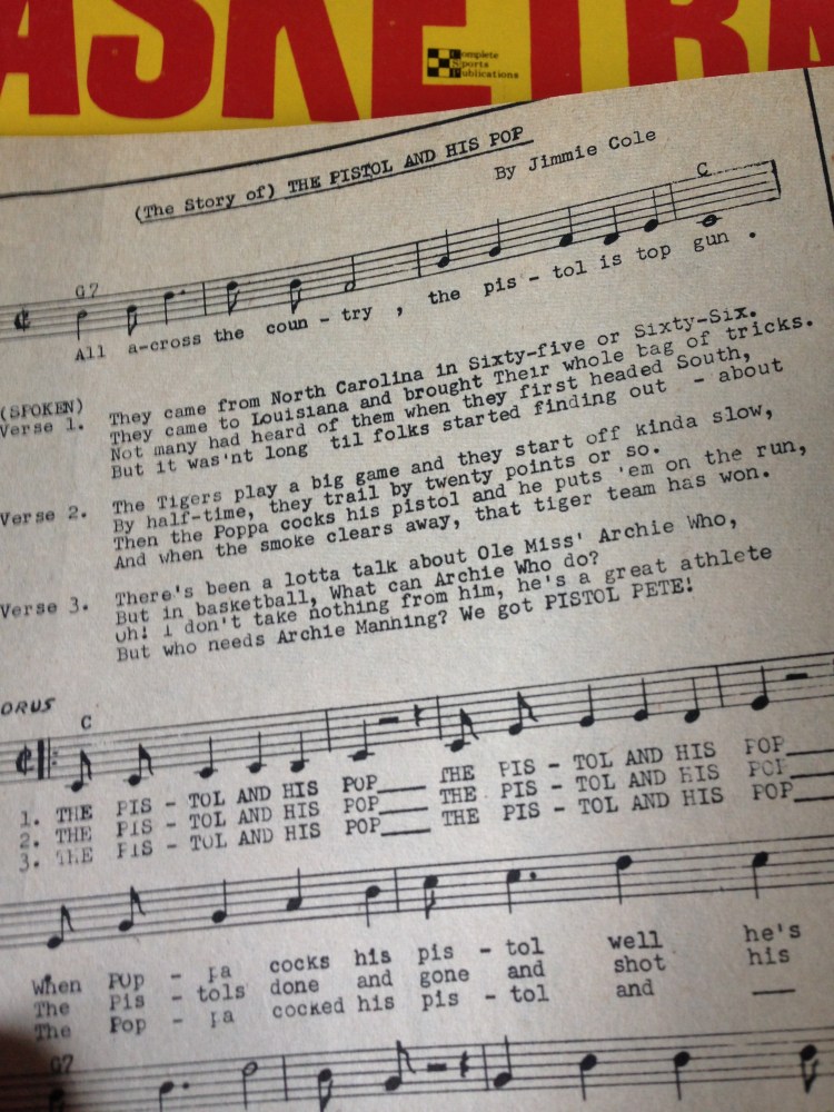 He was probably the first college basketball player whose scoring feats were so commercialized. During his senior year, there were two phonograph records and two entire books devoted to him. For $1 each, one could purchase “The Ballad of Pete Maravich,” or “The Story of Pistol Pete and his Pop.” Besides the records, there was also a 40-page magazine entitled “Maravich” that sold for a dollar and a book Pistol Pete, selling price $1.95.