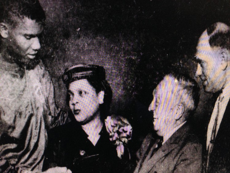 In a happier time, Stokes (left) receives the NBA Rookie of the Year Award. His mother stands next to him. NBA President Maurice Podoloff (second from right) smiles at Stokes.