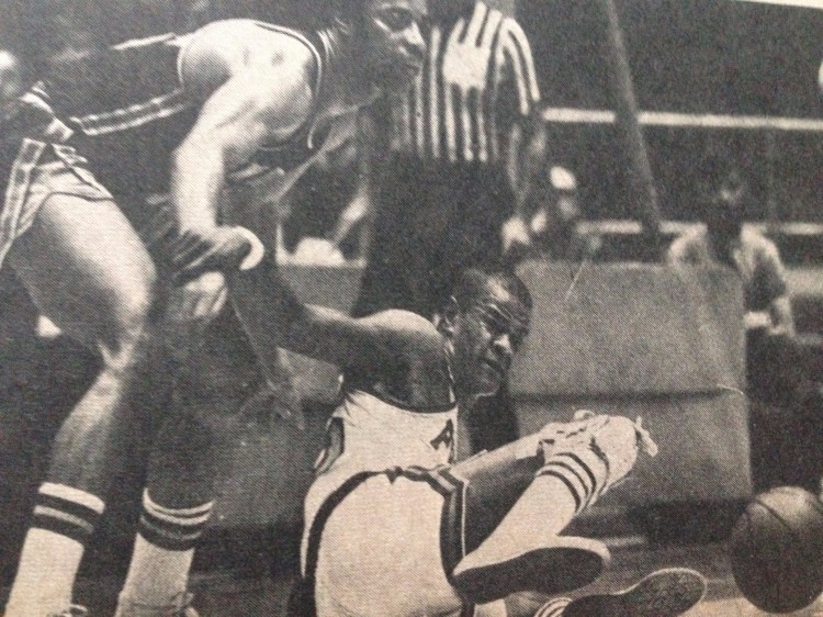 “Let the guards keep the ball as much as you can,” is this suggested strategy. “While the guard has it, the other four guys are standing around and watching. Stay up tight on Bing, and try to force him left. He likes to drive right to a spot at the baseline halfway to the corner. He can jump so high, he goes over his man, and it’s a problem if you let him get in close where he wants to go. Watch out for Happy Hairston, who likes to sneak off when you take a shot.”