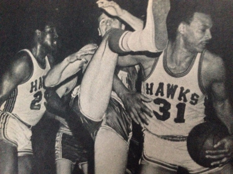 Bridges must be kept away from the boards, because that’s where he does the most damage. “He’s not much of a shooter from a distance,” it was explained. “He likes to throw a sweeping hook going right across the lane, so make him go left. The Hawks like to run a pattern offense, so double-team the guards and force them to the sidelines. Hazzard likes to come down the middle from right to left.”
