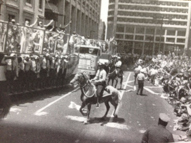 They came home to a tumultuous celebration, a parade watched by an estimated 1.7 million, followed by victory laps in convertibles around the baseball stadium. Cunningham, giddy with euphoria, held the glittering trophy aloft in the brittle sunshine. The 50,000 fans at Vet Stadium chanted and shouted.