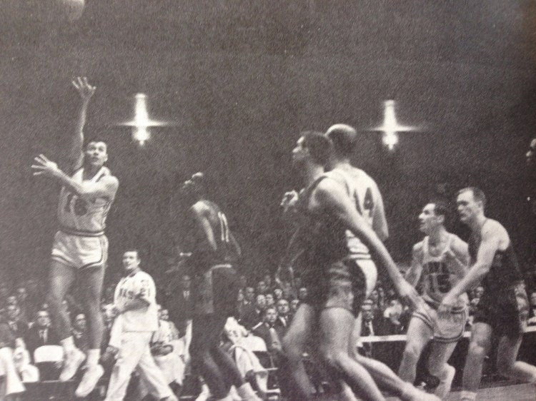 Before the start of the game, Los Angeles coach Bill Sharman, another ex-NBA star, talked about Cliff Hagan. “He had big games,” said Sharman. “But he was at his best in the playoffs. When I was with the Celtics, we played St. Louis in four playoffs, and Hagan was always terrific. I know Bill Russell used to say Hagan was the toughest guy for him to handle in the pivot. Cliff could palm the ball so well with either hand. He’d use the basketball to shield Russell off—or one hand to push Bill and the other to throw up a hook shot.”