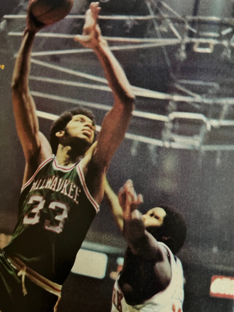 The Knicks moved downcourt, Willis running hard, moving to the right of the key, with Abdul-Jabbar’s huge arm poised in front of him like a railroad gate. Reed moved left, took a pass, and hit a faraway jump-shot to tie the score 2-all. The cheer exploded again when Willis rebounded off the offensive boards a minute later. Then the silence began to grow. The Knicks were missing; the Bucks were hitting. Abdul-Jabbar was fouled by Reed and sank two; 30 seconds later, Kareem broke for the basket, took an Oscar Robertson pass, and slammed it through. With barely three and a half minutes gone, Milwaukee led, 14-3.