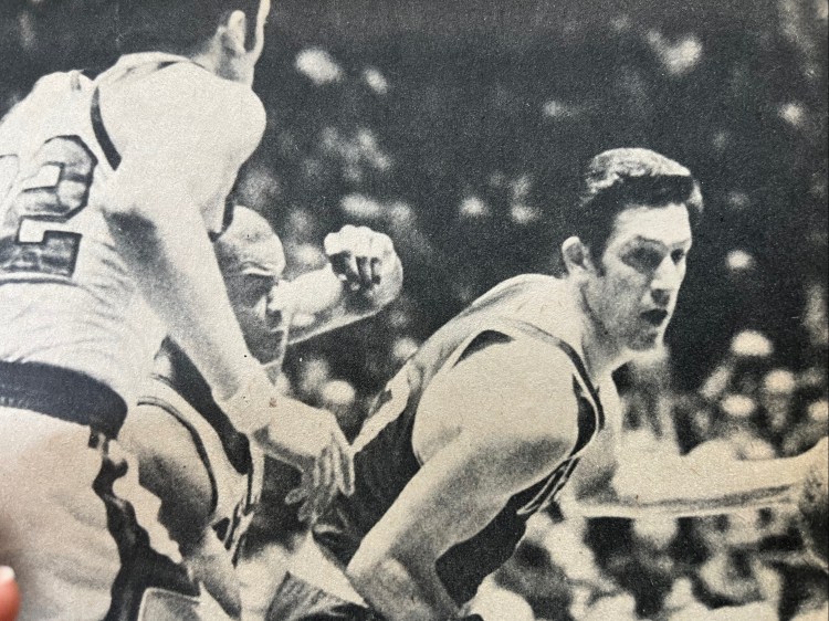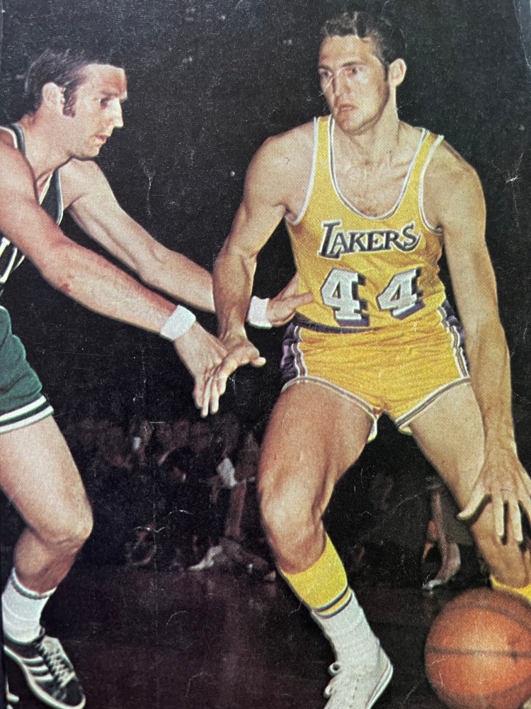 What follows is Libby’s thought on these two all-time greats, or pro’s pros, for Complete Sports’ 10th Annual Basketball magazine. The magazine features a color cover photo of West driving on Boston’s Larry Siegfried, not Havlicek. And it’s pasted just below.]
