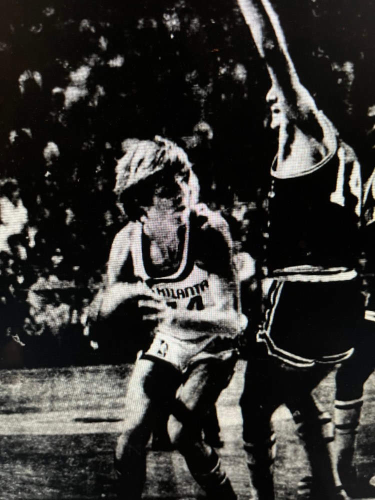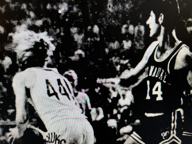 For that instant, it was a tableau in which everything was a blur of elbows and kneecaps, heading toward the Hawks’ basket, except for Pete Maravich, who was now a blur heading the other way with the ball. There was a hole up the middle, and then off to one side. It drew the dribbling Pete Maravich in one quick burst down the court to the Bucks’ side, by which time everyone else had recovered and had begun their own pursuit. But no one was open yet, so Pete Maravich, 18 ½ feet from the enemy bucket, put on his screeching sneakers (an off-balance Buck went sailing past him), leaped straight up and—swish!—two points. The house almost came down with the cheering.