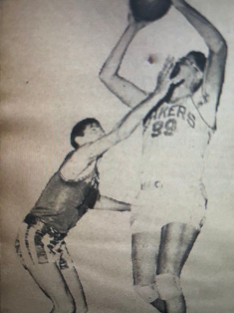 Then, too, on the Olympians, we use the weak-side forward a lot to help me out. That is, if the ball is in play on the right side of the court, the forward playing the left side will come back to see what he can do to get in Mikan’s hair. It doesn’t always work, but it’s comforting to know that somebody else is trying to give you a hand.