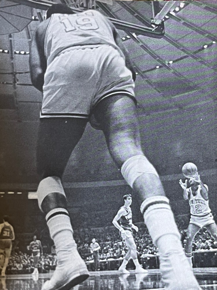 Frazier and Barnett. The heart of this defense. Instead of three-quartering their men, they front them. They play facing the ball, backs to their men, eyes on the ball, while Holzman yells, “See it, see it, see it” from the sideline. Frazier with the quick hands, so quick it is almost disturbing, is there to gamble on the pass. He is there to make the steal, to break the game, which he does anywhere from six to 12 times a night. And then he goes bounding downcourt, cocky even then, dribbling with a swagger, and if they are home, the Garden rocks and shakes with the thunder of the captivated, wild-eyed crowd.