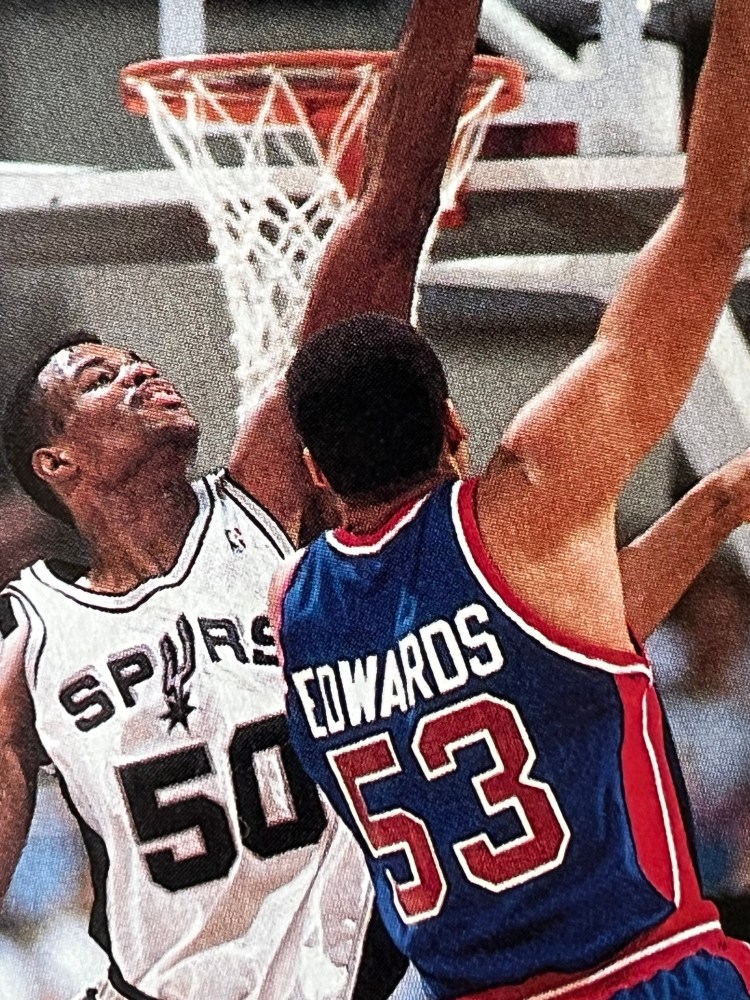 So Brown made several offseason moves, all with Robinson in mind. First, all-star guard Alvin Robertson and for [University of] Houston Cougars forward Greg (Cadillac) Anderson were shipped to Milwaukee for high-scoring forward Terry Cummings. Then came the luck of the lottery and draft, and the Spurs wound up with fleet Arizona forward Sean Elliott, who was the NCAA Player of the Year in 1988-89.