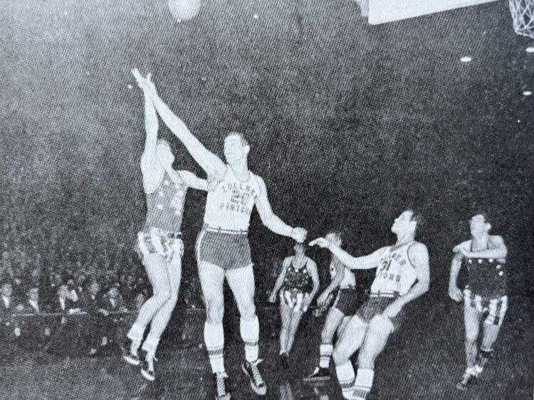 Tom Close dropped a one-hander in to put the Collegians ahead again. McDermott connected under the basket and a minute later left the game on fouls when he tripped Mikan.