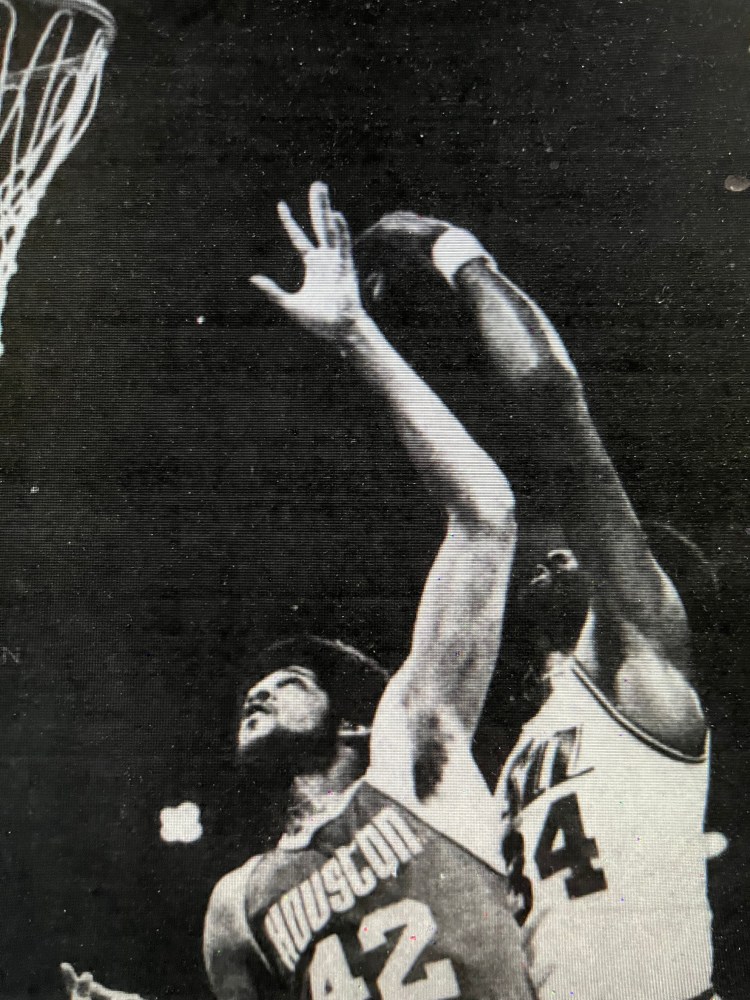 It appeared to be a one-point advantage when 6-foot-10 Dennis Awtrey accepted a pass 10 feet from the basket with nary a Rocket to contest him for the easy shot. Except one. As Awtrey lifted the ball over his head preparing to push in the easy basket, Ratleff came soaring in from the side, batted the ball off course as it left Awtrey’s fingertips, then zipped downcourt on the front end of a Rocket fastbreak. Two passes later he got possession, underhanded a layup, and Houston’s lead was again a safe five points.