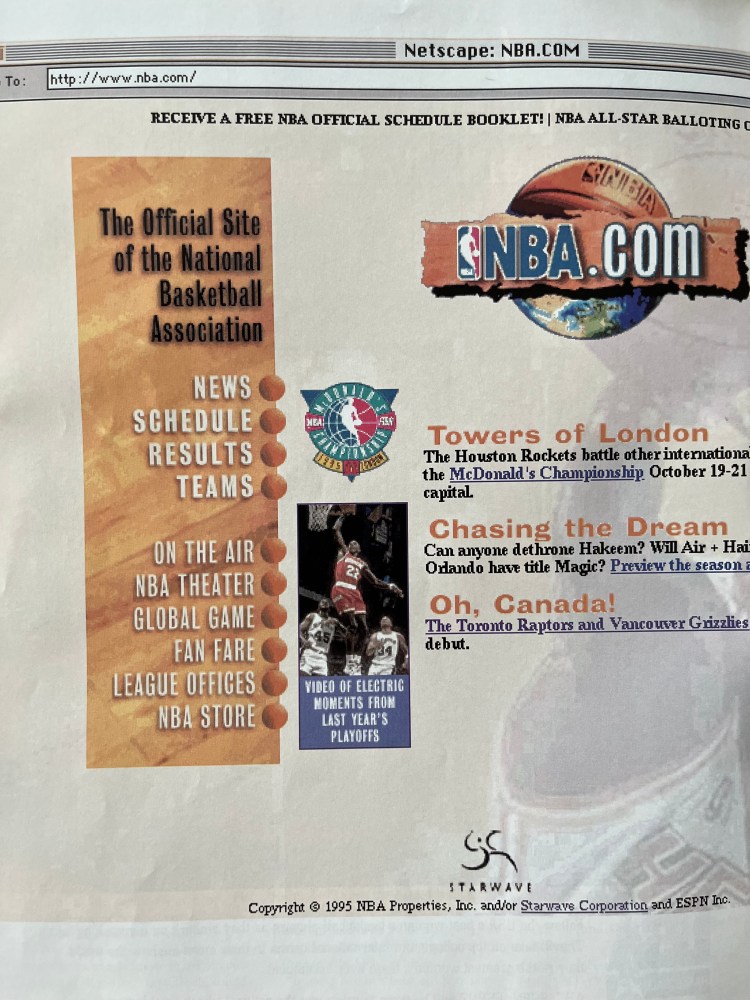 [From Way Downtown highlights pro basketball in select, mostly hard-to-find print media from the 1940s through the 1990s. The latter decade takes readers up the first rumblings of this newfangled thing called the World Wide Web. Below is one of the first articles to unveil NBA.com, “the league’s new Web site” on Netscape, no less.
