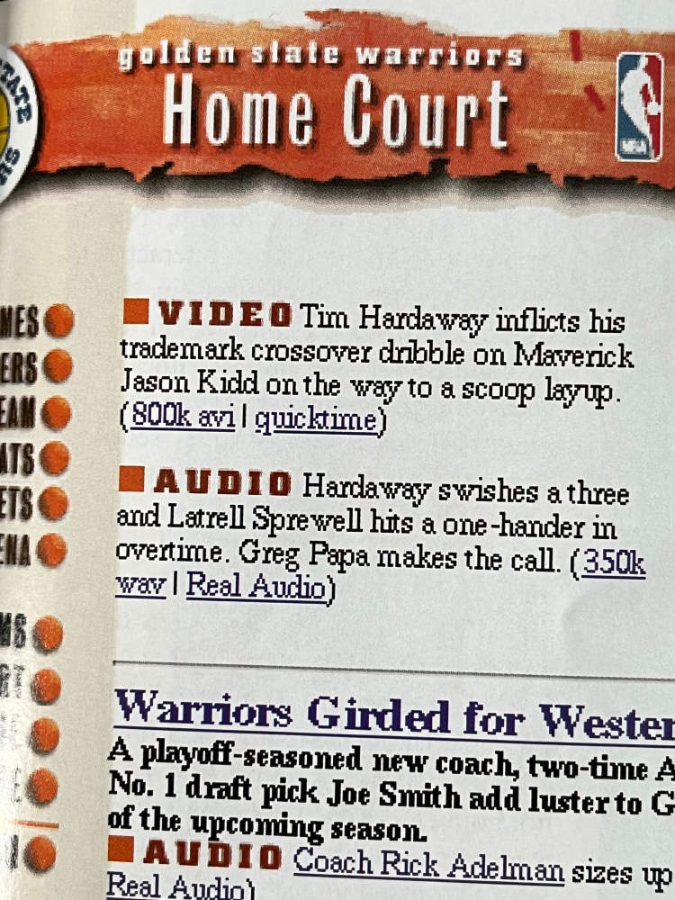 The article, published in the December 1995 issue of the Golden State Warriors’ in-house print magazine called Playbook, touts the wonders of dialing in from home on your modem to access NBA.com online. The league originally controlled its entire online presence, with each of the NBA’s 29 teams having their own subpage, or “home court,” on NBA.com. Writer Ted Brock does his best to envision where all of this online stuff could take fans in the future. But it was impossible then to predict the rise of Smart phones and all of the advanced gadgetry that’s now the new normal.