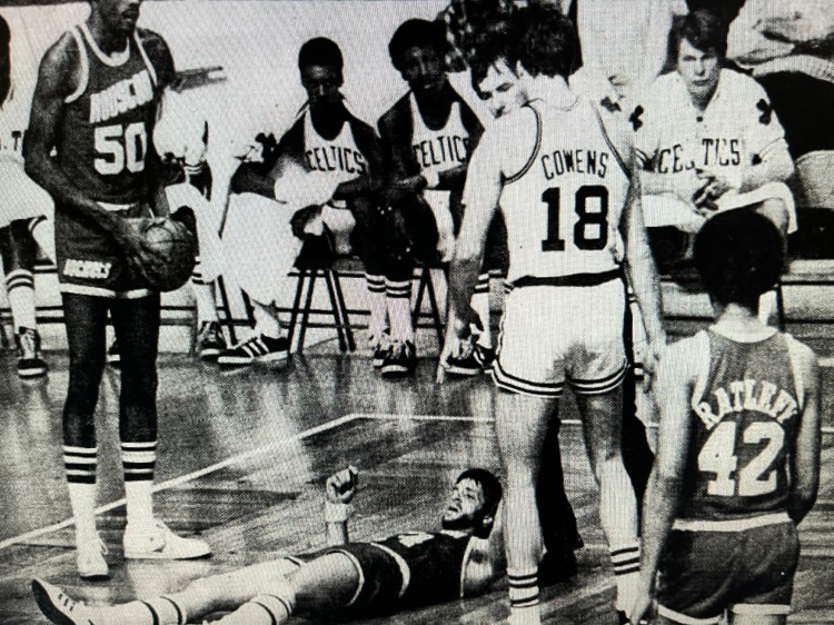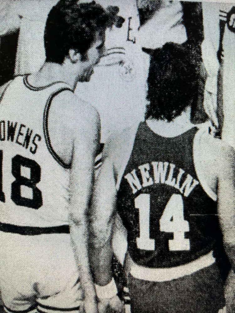 Cowens broke into a sprint and blind-sided Newlin, sending sprawling to the court on his back. “Whistles blew,” wrote Boston Globe columnist Leigh Montville. “There was a spectacular gasp usually saved only for the dropping of a prime heavyweight at an unexpected moment.”
