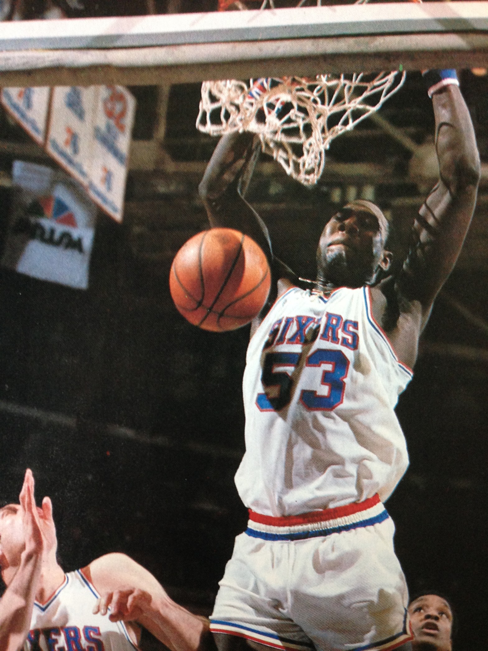 Toward the end of the game, Kareem Abdul-Jabbar comes out to guard Dawkins. They hit each other as Dawkins crosses into the lane and suddenly Jabbar is going backwards. Dawkins gets the ball and dunks.